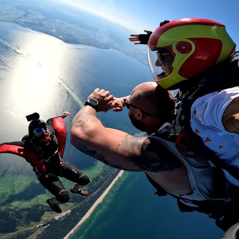 | Skok z dodatkowym kamerzystą – wariant ze zdjęciami i filmem z kamery instruktora. W tym pakiecie dodatkowy skoczek operator – kamerzysta nagrywa dodatkowy materiał z perspektywy drugiej osoby |